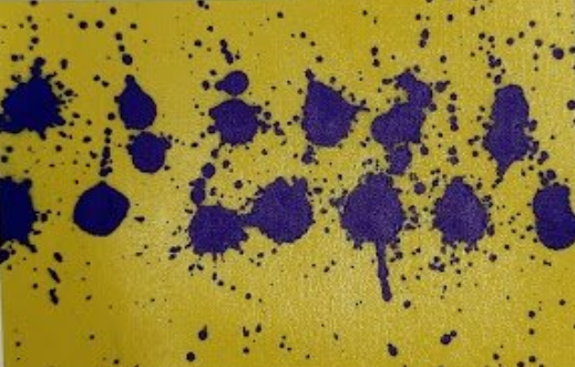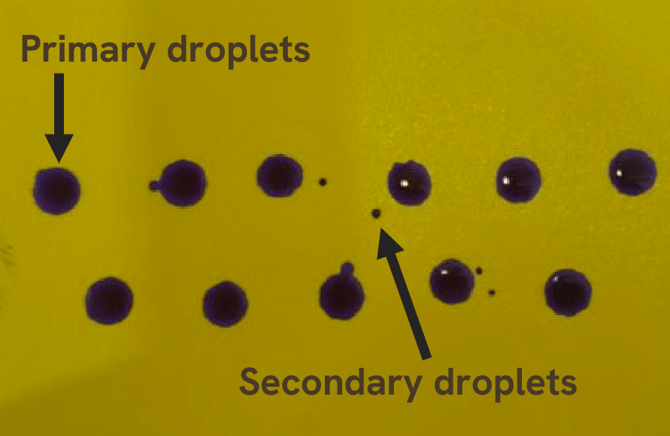 Place water-sensitive paper under weeds and spray. Look for secondary droplets and estimate how many are present. The image below shows typical behaviour. In general, the fewer secondary droplets, the better.