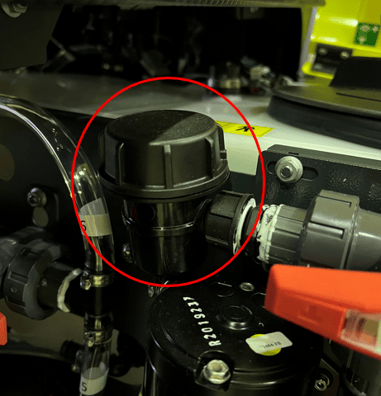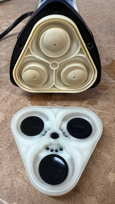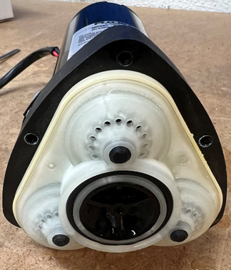 The pump generates pressure through volumetric displacement. The three-chamber design includes a membrane that oscillates eccentrically. Due to the diaphragm check-valve system, liquid is drawn into and expelled from the chambers as the membrane moves. The pump cannot build up pressure if the diaphragm fails to seal properly. This can occur if particles become trapped between the membrane and the valve seat, causing internal leakage. Such particles may originate from debris, undissolved herbicide, or crystallized herbicide due to improper flushing after operation or unexpected shut down of the robot.