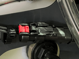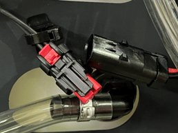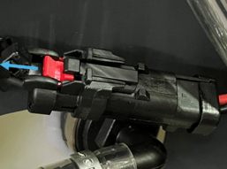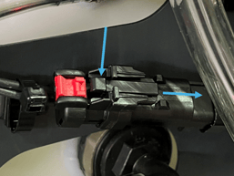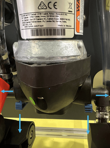 - Disconnect inlet and outlet hoses by pulling down the blue connection locks as shown below. This will release the angled hose barbs.