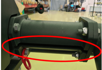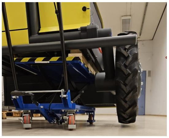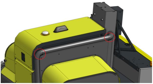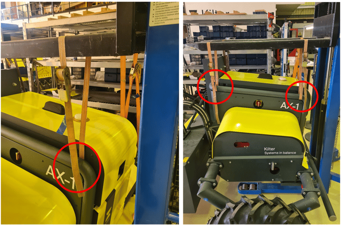 Place straps around the frame at the two locations shown in the figure below, and the same two locations on the other side. With straps around the frame at these four locations, you can use a tractor, a forklift, a crane, or similar to lift the robot. Remember to only lift the robot so that the wheels barely loose contact with the ground. Note: The gap between the frame and the cover is relatively narrow, so the strap can’t be too thick, nor have a hook.
