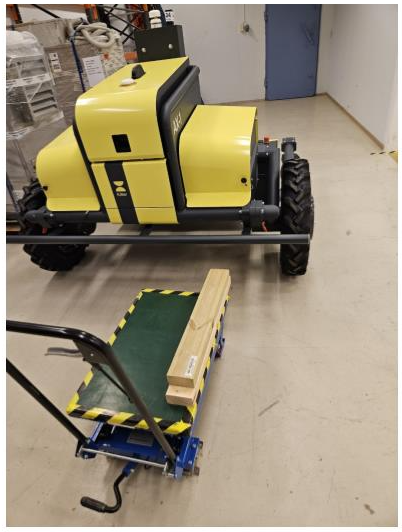 The below image shows an example of how a table-jack is used to lift one side of the robot at a time. Here planks are used on a jack trolley to lift the robot without having to remove the bumper.