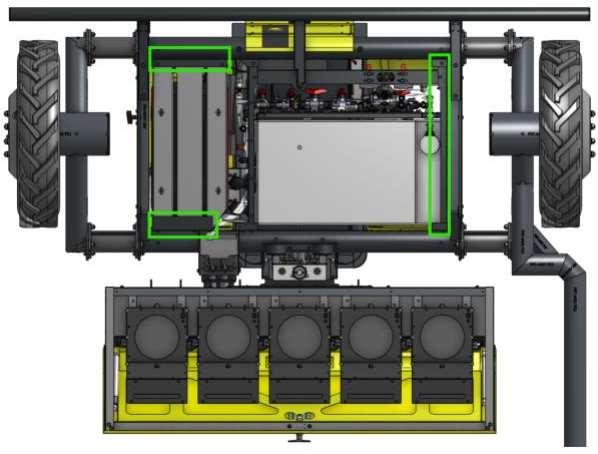The green rectangles shows where you can apply force without damaging the robot. Make sure to apply force only to the marked brackets and/or frame, and not to the tank or any other components.