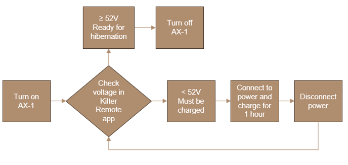 The battery is ready for storage when the voltage is 52 V, this must be checked in the Kilter Remote app when the AX-1 is on and not connected to charging power.